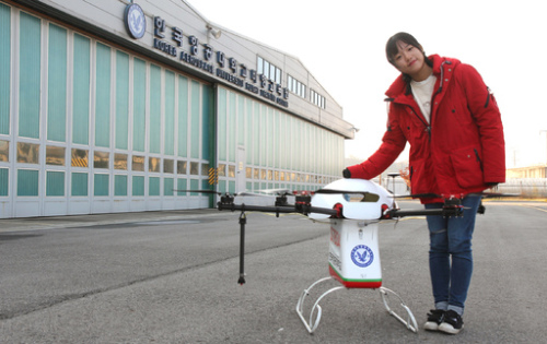 | 최연소 드론 조종자 국가자격증 취득자인 천승주(15)양이 9일 한국항공대학교 비행교육원 앞에서 드론에 손을 얹은 채 포즈를 취하고 있다. 연합뉴스 |