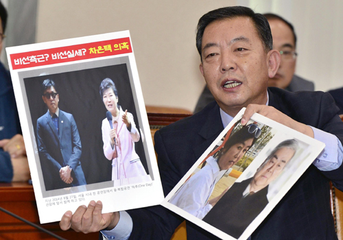 | 무소속 이찬열 의원이 10일 국회에서 열린 평창동계올림픽 및 국제경기대회 지원 특별위원회 전체회의에서 박근혜 대통령과 ‘문화계 황태자’ 차은택씨의 사진(왼쪽)과 비선실세 최순실씨와 조양호 전 평창동계올림픽 조직위원장(한진그룹 회장)의 사진(오른쪽)을 들어보이며 질의하고 있다. 이재문 기자 |