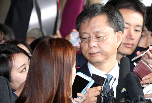 | 직권남용 혐의 등 각종 비위 혐의로 고발된 우병우 전 청와대 민정수석비서관이 6일 피의자 신분으로 서울중앙지검에 출석하면서 취재진이 가족회사 ‘정강’의 자금 횡령 등에 대해 묻자 불쾌한 표정으로 바라보고 있다. 하상윤 기자 |