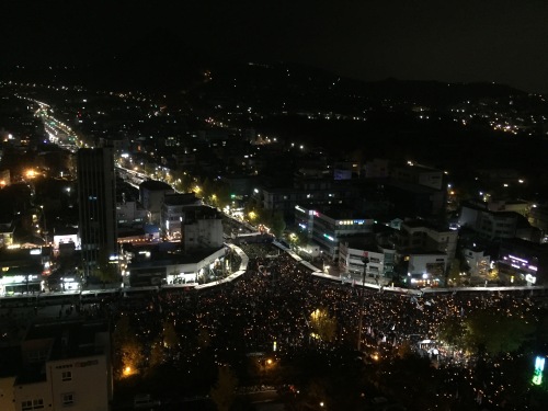 | 대통령 퇴진을 요구하는 민중총궐기 대회가 열린 12일 오후 대회에 참가한 시민들이 서울 광화문광장과 시청광장에서 촛불을 밝히고 행진하고 있다. 사진=공동취재단 |