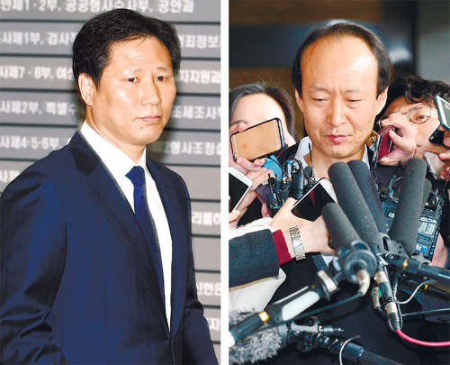 | ‘문고리 권력’ 안봉근·이재만도 나란히 소환 구속된 정호성 전 청와대 부속비서관과 함께 박근혜 대통령의 ‘문고리 3인방’인 안봉근 전 국정홍보비서관(왼쪽), 이재만 전 총무비서관이 14일 검찰 조사를 받기 위해 서울 서초동 서울중앙지검에 들어서고 있다. 남정탁 기자 |