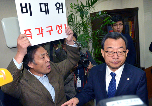 | 새누리당 이정현 대표(오른쪽)가 15일 오전 여의도 당사에서 원외당협위원장과의 면담을 마치고 나오자 심정우 광주광산을 당협위원장(왼쪽) 등이 ‘비대위 즉각 구성’이라는 손팻말을 들고 이 대표 사퇴를 촉구하고 있다. 남정탁 기자 |