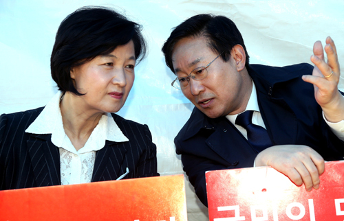 | 더불어민주당 추미애 대표(왼쪽)가 15일 서울 서초동 서울중앙지검 앞에 마련된 민주당 천막 농성장을 방문해 박범계 의원과 이야기하고 있다. 박 의원 등은 우병우 전 민정수석의 구속수사를 촉구하는 시위를 벌이고 있다. 이제원 기자 |