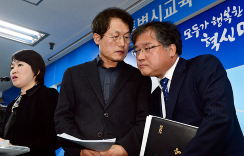 | 조희연 서울시교육감(가운데)이 16일 시교육청 브리핑실에서 정유라씨에 대한 청담고 특정 감사 중간결과 발표 도중 이민종 감사관에게 귓속말을 하고 있다. 남정탁 기자 |