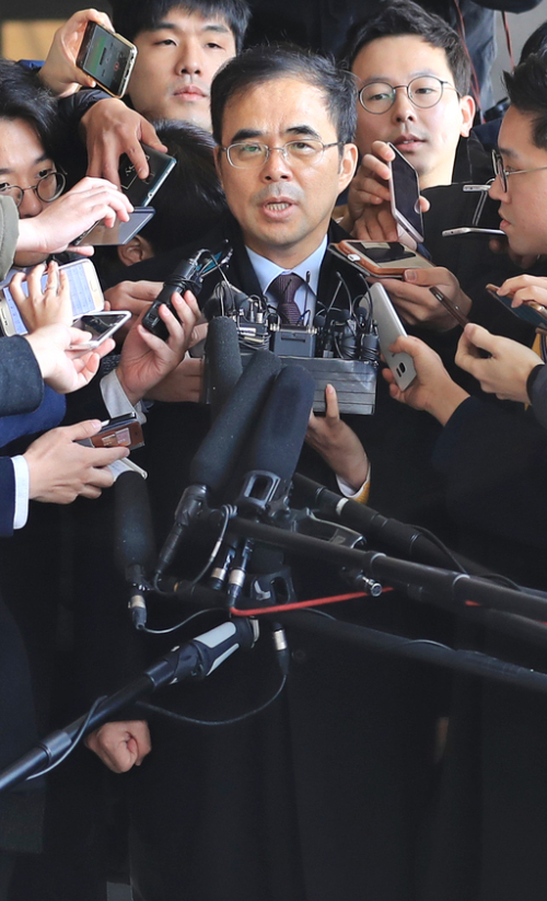 | ‘체육계 황태자’도 검찰에 ‘체육계 황태자’로 불리며 최순실씨의 국정농단에 한 축을 담당한 의혹을 받고 있는 김종 전 문화체육관광부 2차관이 16일 피의자 신분으로 조사를 받기 위해 서울 서초동 서울중앙지검에 들어서면서 취재진의 질문에 답하고 있다. 연합뉴스 |