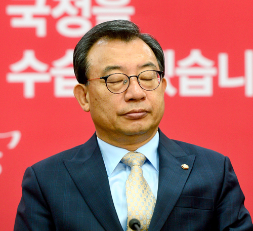 새누리당 비박(비박근혜)계로부터 사퇴 압박을 받고 있는 이정현 대표가 17일 오전 여의도 당사에서 열린 최고위원회의에 참석해 두 눈을 감은 채 생각에 잠겨 있다. 남정탁 기자 |