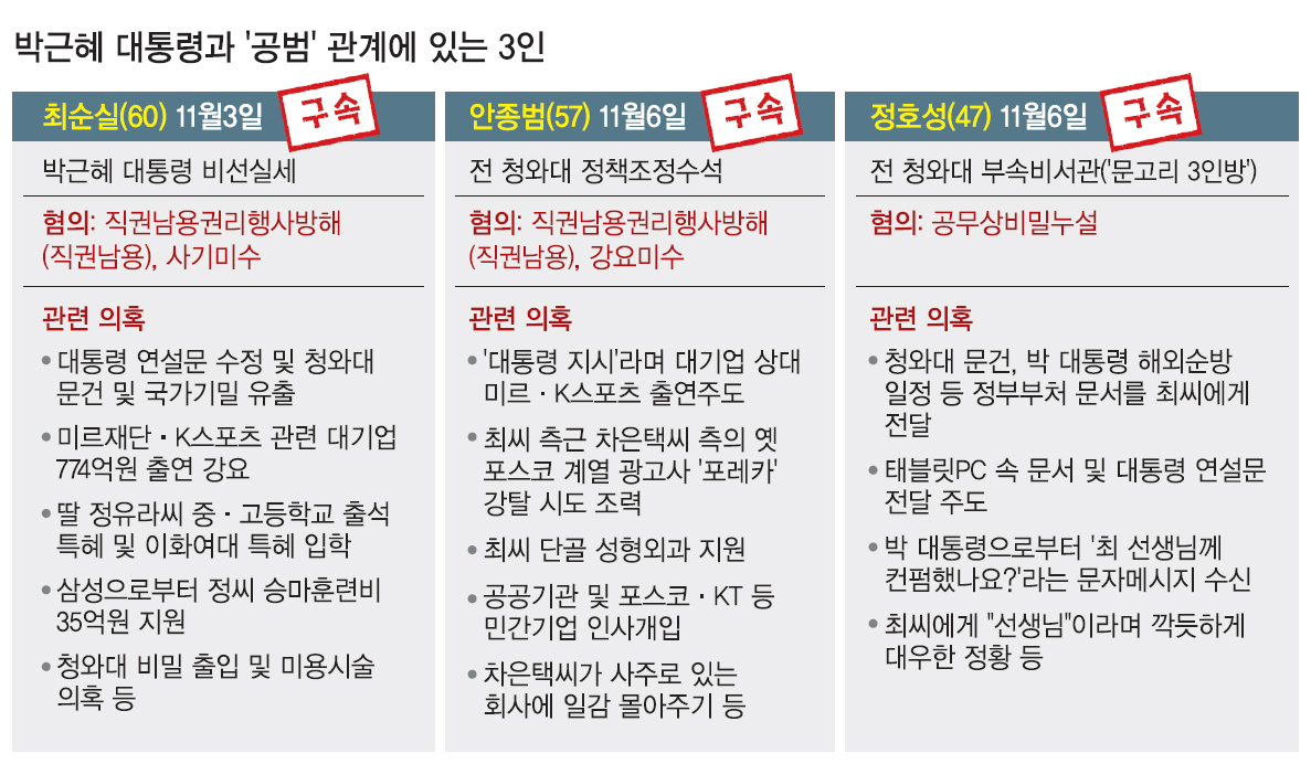 검찰은 20일 최씨 등 구속 피의자 3명을 재판에 넘길 계획이다. 그때 박 대통령과 3인을 공범으로 볼 수 있는 정황을 검찰이 얼마나 공개할지가 변수로 떠오르고 있다.