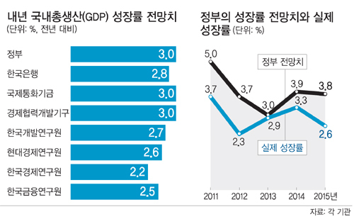 실제 정부와 한국은행의 성장률 전망치는 실제 성장률과는 큰 차이를 보이고 있다. 기재부가 발표한 연간국내총생산(GDP) 성장률 전망치(전년도 12월 기준)와 실제 성장률 간 최근 5년간 평균오차가 0.92%포인트에 달했다. 한은은 0.86%포인트였다. 정부와 한은이 경제실상을 제대로 반영하지 못한 채 장밋빛 전망만 내놓았다는 비판이 나온다.