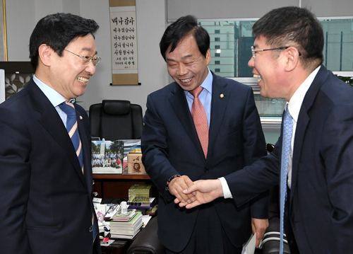 | 최순실 국정농단 의혹을 조사하기 위한 국회 국정조사특별위원회 간사인 새누리당 이완영(가운데), 더불어민주당 박범계(왼쪽), 국민의당 김경진 의원이 21일 오전 국회 의원회관에서 증인채택 협상문제를 논의하기 위해 회동한 자리에서 인사를 나누고 있다. 연합뉴스 |