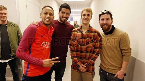 | FC바르셀로나 리오넬 메시(맨 오른쪽)가 21일(한국시간) 스페인 바르셀로나 훈련장을 찾은 팝스타 저스틴 비버(오른쪽에서 두 번째)와 기념사진을 찍고 있다. 오른쪽에서 세 번째는 수아레스, 네 번째는 네이마르. FC바르셀로나 홈페이지 캡처 |
