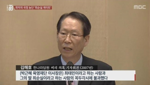 | 김해호 목사가 2007년 6월 한나라당 대선 후보 경선 때 당시 박근혜 후보와 최태민 일가의 유착 의혹을 제기하는 기자회견을 하고 있다. MBC 화면 갈무리 |