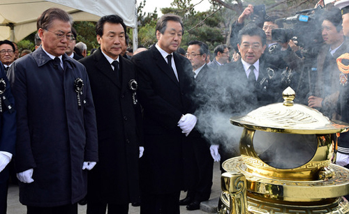 여야 대선주자들이 김영삼 전 대통령 서거 1주기인 22일 서울 동작구 국립현충원 김 전 대통령 묘소에서 나란히 참배하고 있다. 왼쪽부터 더불어민주당 문재인 전 대표, 손학규 동아시아미래재단 상임고문, 새누리당 김무성 전 대표. 이제원 기자 |