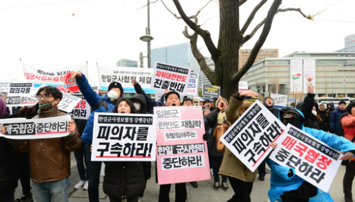 | 22일 오전 서울 세종로 정부서울청사 정문 앞에서 사드저지전국행동, 박근혜정권 퇴진 비상국민행동, 전쟁반대평화실현국민행동이 공동 주최한 한일군사정보보호협정 국무회의 의결 중단 및 박근혜 대통령 퇴진 촉구 기자회견에서 참가자들이 정부청사를 향해 구호를 외치고 있다. 남정탁 기자 |