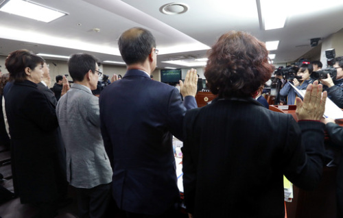 | “진실만을 말하겠습니다” 박근혜 정권의 비선 실세 최순실씨의 딸 정유라씨가 졸업한 서울 청담고등학교의 전·현직 교장과 교사들이 22일 서울시의회 별관에서 열린 시의회 교육문화위원회 2차 행정사무감사에 앞서 증인선서를 하고 있다. 연합뉴스 |