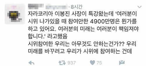 22일 한 트위터리안은 이봉진 사장의 강연 내용 중 일부를 게재했다. 해당 게시글에 따르면 이 사장은 "여러분이 시위에 나가 있을 때 참여 안하는 4900만명은 무엇인가를 하고 있다. 여러분의 미래는 여러분이 책임져야 한다"라고 말했다.