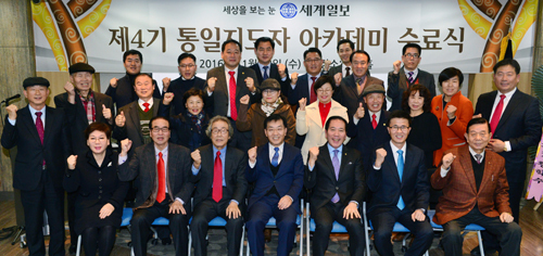 제4기 통일지도자 아카데미 수료식 입력 : 2016-11-23 22:35:59 수정 : 2016-11-23 22:35:59 구글 네이버 유튜브 23일 오후 서울 종로구 세계일보 유니홀에서 열린 ‘제4기 통일지도자 아카데미 수료식’에서 차준영 세계일보 사장(아랫줄 가운데)과 수료생들이 기념촬영을 하고 있다. 남정탁 기자 Copyright ⓒ 세계일보. 무단 전재 및 재배포 금지 세계일보 이정우