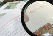 | 28일 정부세종청사 교육부에서 공개된 국정 역사교과서 현장검토본에 ‘대한민국 수립’이라는 표현(붉은색 원안)이 사용돼 있다. 교육부는 대한민국의 정통성을 분명히 밝히기 위해 ‘대한민국 정부 수립’이라는 표현 대신 ‘대한민국 수립’이라고 기술했다고 밝혔지만 광복회는 일제 때 독립운동을 한 독립투사들을 폄훼했다고 강하게 반발하고 있다. 세종=연합뉴스 |