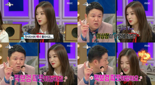 이에 아이린은 “아시다시피 매너 좋으시고 계단 내려갈때 손 잡아주시고”라고 말했다. 이에 김구라는 “박보검 같은 타입은 별로 안 좋아하는지?”라고 물었다.