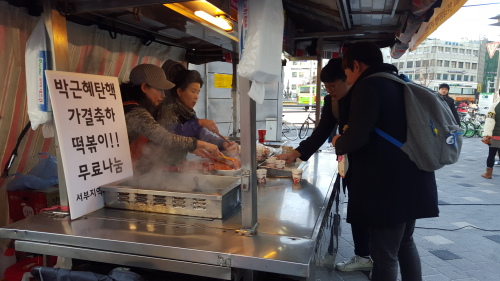 앞서 서울 서부지역노점상연합(서부노점상련)은 전날 국회에서 박근혜 대통령 탄핵이 가결되면 떡볶이를 무료로 나눠주겠다고 공언했다. 약속대로 이날 오후 1시부터 시작된 행사는 오후 4시까지 신촌과 이화여대, 홍익대 인근 총 4곳의 노점상에서 진행됐다.