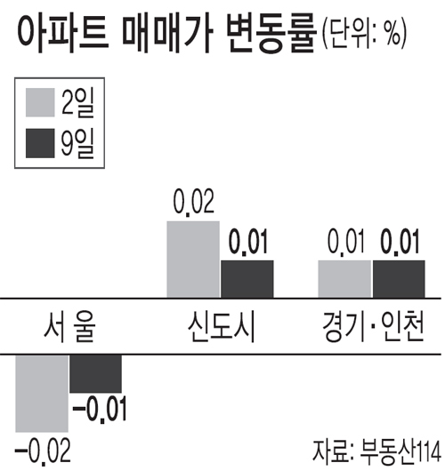 신도시와 경기·인천도 매수심리가 얼어붙으면서 아파트 매매가격이 각각 0.01%씩 오르는 데 그쳤다.