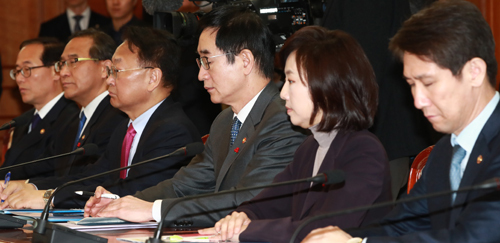 | 황교안 권한대행 주재 국무위원 간담회 유일호 경제부총리 겸 기획재정부 장관(왼쪽 세번째)을 비롯한 국무위원들이 지난 10일 오전 정부서울청사에서 황교안 대통령 권한대행 주재로 열린 국무위원 간담회에서 황 권한대행의 발언을 듣고 있다. 사진공동취재단 |