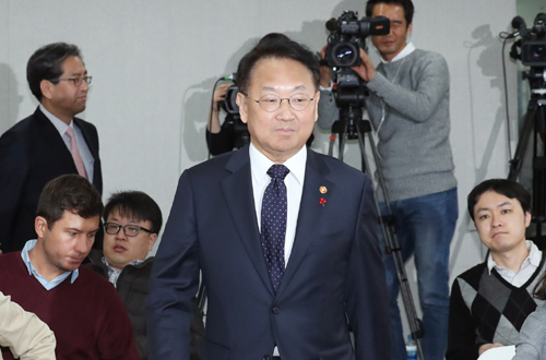 | 유일호 경제부총리 겸 기획재정부 장관이 11일 서울 프레스센터에서 열린 외신기자 간담회를 위해 입장하고 있다. 연합뉴스 |