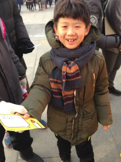 | 현일초등학교 학생 정찬영(7)군이 17일 서울 광화문광장에서 열린 국민 엽서 보내기 운동에 참가해 엽서를 쓴 뒤 미소 짓고 있다. 안승진 기자 |