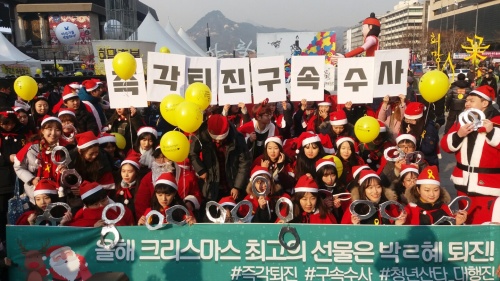 징글벨 합창을 마친 뒤 ‘올해 크리스마스 최고의 선물은 박근혜 퇴진’이라고 적힌 현수막을 들고 광화문 일대를 행진한 이들은 주변의 아이들에게 선물을 나눠주면서 행사를 마무리했다.