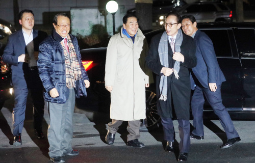 | 이명박 전 대통령(왼쪽 세번째)이 18일 오후 친이(친이명박)계 인사들과 만찬을 함께하기 위해 새누리당 이재오 전 의원(왼쪽 두번째), 정정길 전 대통령 비서실장(왼쪽) 등과 함께 서울 강남 한 식당에 들어서고 있다. 연합뉴스 |