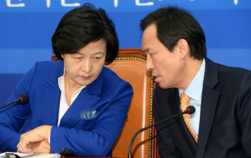 | 더불어민주당 추미애 대표와 우상호 원내대표가 19일 오전 국회에서 열린 최고위원회의에서 대화하고 있다. 이재문기자 |