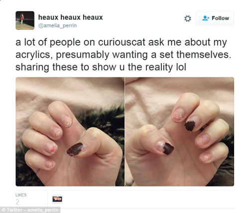 영국 에식스에 거주 중인 20세 아멜리아 페린은 최근 끔찍한 일을 겪었다. 그는 트위터에 “많은 사람이 제게 ‘인조 손톱’에 대해 질문합니다. 현실을 보여주고자 이 사진을 공유해요”라며 자신의 손 사진을 올렸다.