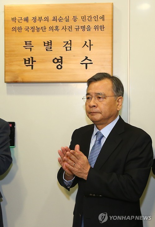 현판에는 '박근혜 정부의 최순실 등 민간인에 의한 국정농단 의혹 사건 규명을 위한 특별검사 박영수'라는 글자가 또렷하게 새겨졌다.