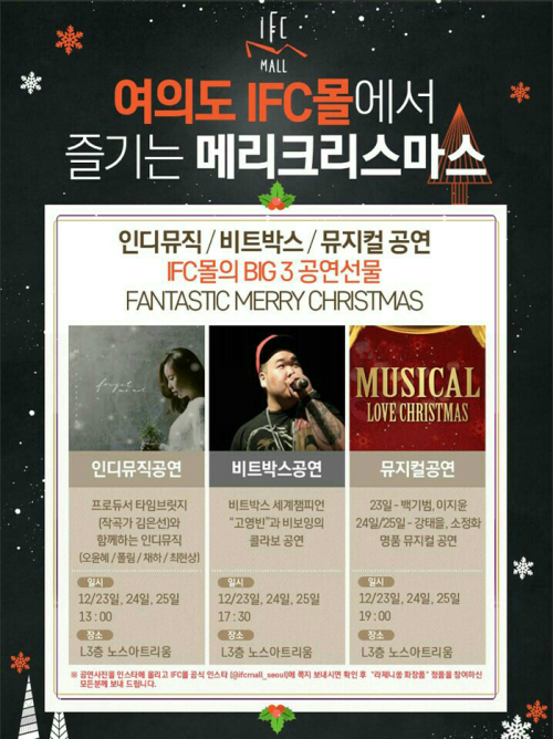 가수 오윤혜, 프로듀서 타임브릿지, 비트박스 세계 챔피언 고영빈, 뮤지컬 스타들이 IFC몰에서 크리스마스의 즐거움이 더하는 공연을 갖는다.