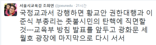 글의 내용은 그가 발표한 성명서의 일부분으로 ‘국정교과서 강행하면 황교안 권한대행과 이준식 총리는 촛불시민의 탄핵에 직면할 것’이라는 문구가 써져 있다.