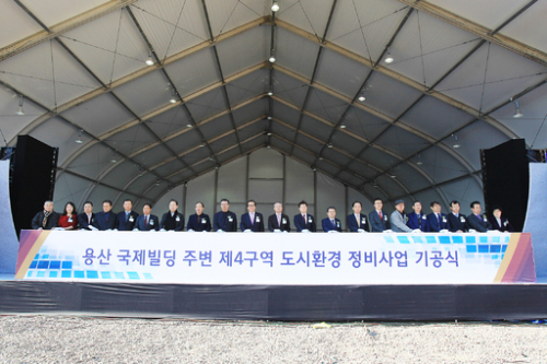 | 지난달 28일 용산 4구역 재개발 현장에서 열린 기공식에 참석한 초청인사, 효성관계자, 조합원 등이 기공식을 알리는 버튼을 누르고 있다. |