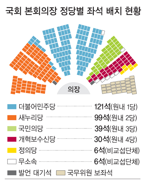 4당체제로 재편되며, 본 회의장 의석배치도 일부 변경됐다. 통상 제1당이 국회의장석을 기준으로 중앙 좌석을 차지한다. 새누리당에서 신당으로 갈라져 나오며 현재 의석수는 민주당 121석, 새누리당 99석, 국민의당 38석, 신당 30석 순이다. 이날 본회의장 중앙에는 민주당이 자리했다. 새누리당은 오른편으로 이동했다. 왼편에는 국민의당, 신당, 정의당, 무소속 의원들이 자리를 잡았다. 신당 합류 의지를 밝혔지만 일단 잔류한 나경원, 김현아 의원(비례대표)은 이날 새누리당 좌석에 앉았다.