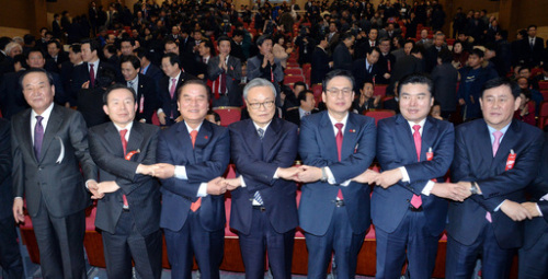 | 새누리당 인명진 비상대책위원장(가운데)이 29일 국회 의원회관에서 열린 당 제6차 전국위원회에서 당 지도부·중진들과 손을 맞잡고 결의를 다지고 있다. 새누리당은 이 자리에서 비대위원장을 합의 추대했다. 왼쪽부터 서청원 의원, 이인제 전 의원, 정갑윤 전국위의장, 인 비대위원장, 정우택 원내대표, 원유철·최경환 의원. 남정탁 기자 |