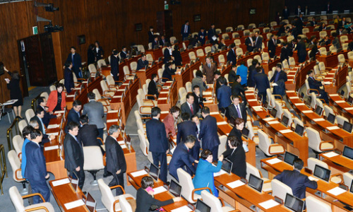 | ‘4당 체제’ 첫 본회의… 자리 이동하는 의원들 4당 체제로 재편된 후 처음 열린 29일 국회 본회의에서 여야 의원들이 새롭게 배치된 자신의 자리를 찾아 이동하고 있다. 개혁보수신당(가칭)의 원내교섭단체 등록으로 제1당이 된 더불어민주당이 중앙, 2당인 새누리당이 오른쪽, 국민의당·개혁보수신당·정의당·무소속 순으로 왼쪽에 배치됐다. 남정탁 기자 |