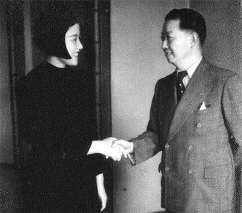 | 1943년 10월 중국 상하이 메이치대희원에서 공연을 가진 최승희가 중국 경극의 명배우인 메이란팡(梅蘭芳)을 만나 악수하고 있다. 동양을 대표하는 두 스타는 허심탄회한 대화를 나눈 것으로 알려졌다. |
