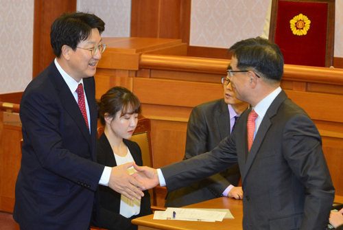 악수하는 권성동·이중환 입력 : 2016-12-30 17:50:37 수정 : 2016-12-30 17:50:36 구글 네이버 유튜브 국회 소추위원단 권성동 법사위원장(왼쪽)과 박근혜 대통령 대리인단 이중환 변호사가 30일 열린 박 대통령 탄핵심판사건 3차 준비절차기일에서 인사를 나누고 있다. 사진공동취재단 Copyright ⓒ 세계일보. 무단 전재 및 재배포 금지 세계일보