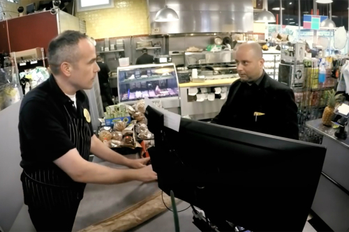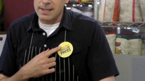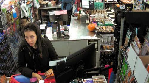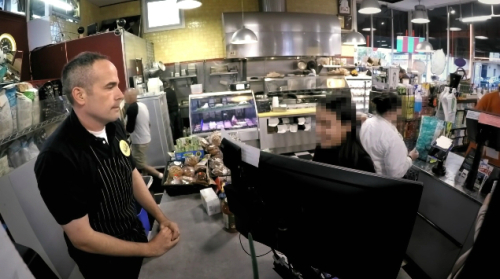 | 점원은 배지를 보여주며 이유를 설명했다. |