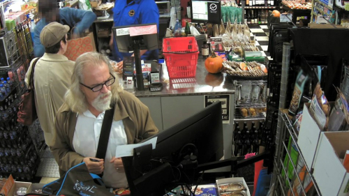 | 가격을 듣고 계산대를 쳐다보는 노인. |