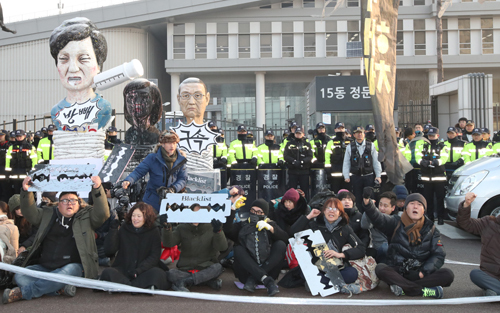 | ‘박근혜 퇴진과 시민정부 구성을 위한 예술행동위원회’ 소속 회원들이 12일 정부세종청사 15동 문체부 앞에서 문화예술인 블랙리스트 작성에 관여한 의혹을 사고 있는 조윤선 문체부 장관을 구속하라며 시위하고 있다. 세종=연합뉴스 |