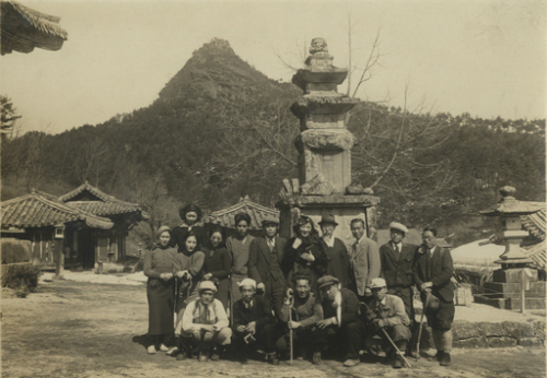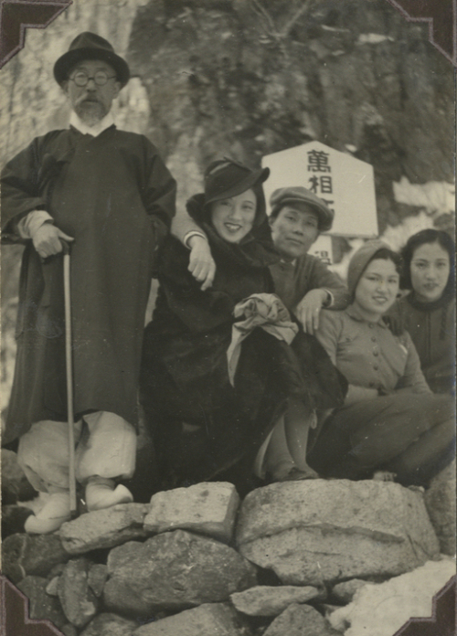 | 1937년 12월 최승희가 영화 ‘대금강산보’ 출연자 등과 기념사진을 촬영하고 있다. 뒷줄 가운데에 안막·최승희 부부와 부친 최준현의 모습이 보인다. |