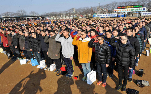 | 병역의무를 수행하기 위해 육군훈련소에 도착한 청년들이 전방을 향해 경례를 하고 있다. 육군 제공 |