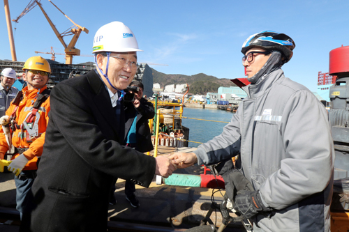 | 반기문 전 유엔 사무총장(왼쪽)이 16일 최근 조선업 침체로 위기에 직면한 경남 거제시 대우조선해양을 방문해 근로자들의 손을 잡으며 격려하고 있다. 거제=연합뉴스 |