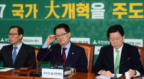 | 국민의당 박지원 대표가 16일 오전 서울 여의도 국회에서 열린 제1차 최고위원회의에서 안경을 고쳐쓰고 있다. 남정탁 기자 |