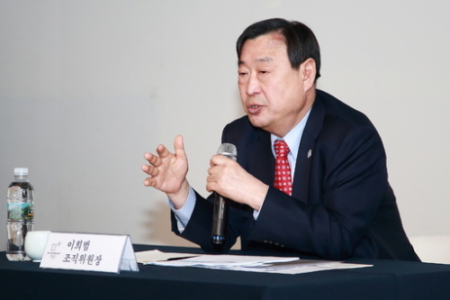 이희범 평창 동계올림픽 조직위원장이 17일 강원도 평창군 고려궁 한옥호텔에서 열린 신년 기자간담회에서 올림픽 붐업 조성의 어려움을 호소하고 있다.