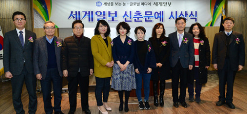 | 17일 ‘2017 세계일보 신춘문예 시상식’에서 수상자와 심사위원 등 참석자들이 기념촬영을 하고 있다. 왼쪽부터 세계일보 정희택 상무, 문학평론가 김화영·김주연, 당선자 석민재·장예원·이상희, 소설가 은희경, 이승현 세계일보 편집인, 시인 황인숙·김사인. 남정탁 기자 |