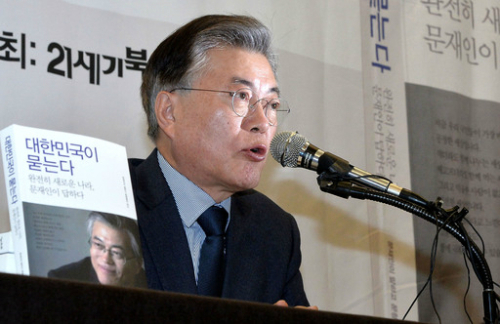 | 야권 유력 대선주자인 더불어민주당 문재인 전 대표가 17일 오전 서울 중구 한국프레스센터에서 열린 대담집 ‘대한민국이 묻는다’ 출판기념회에서 각종 현안에 대한 입장을 밝히고 있다. 하상윤 기자 |